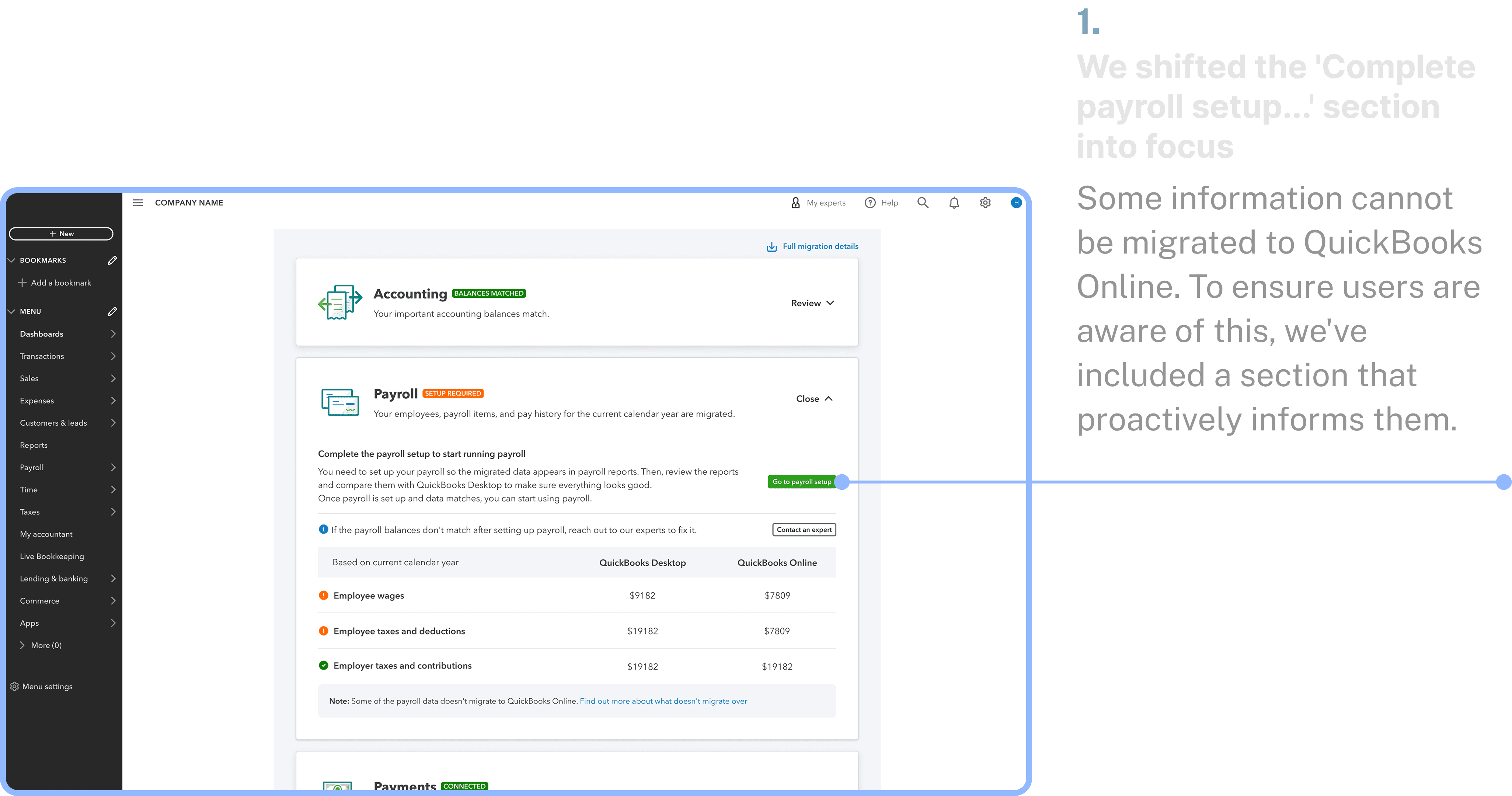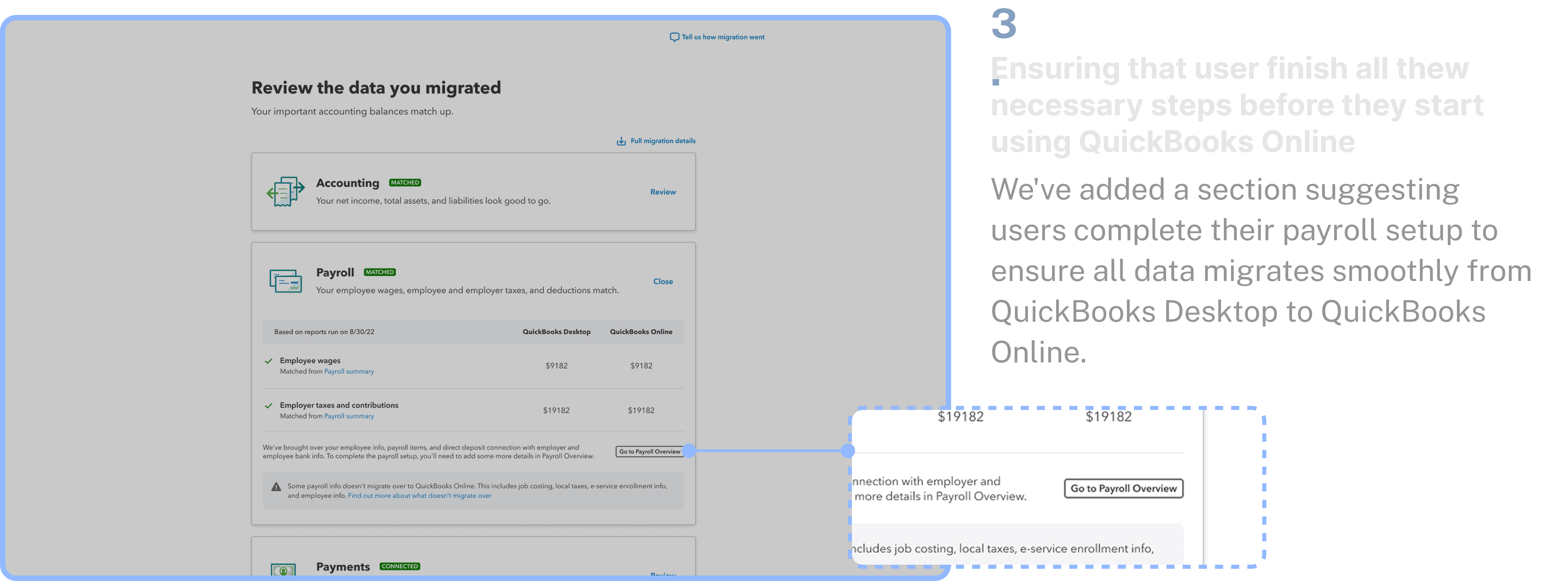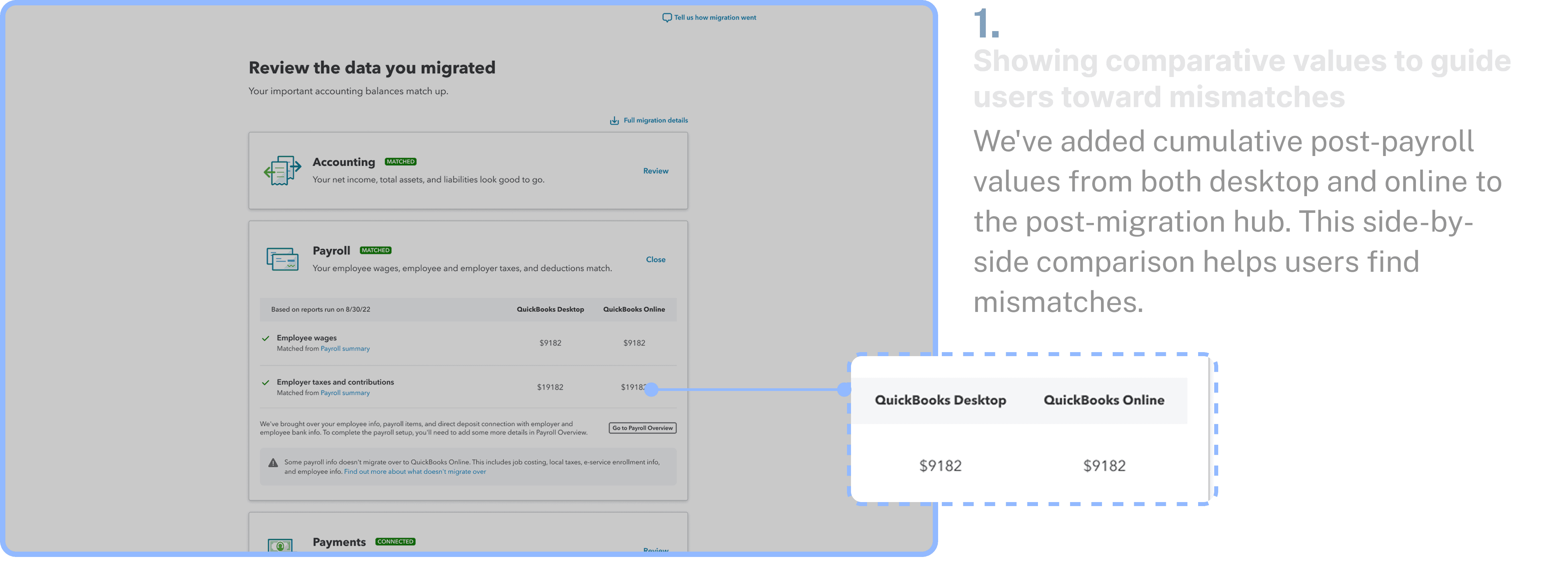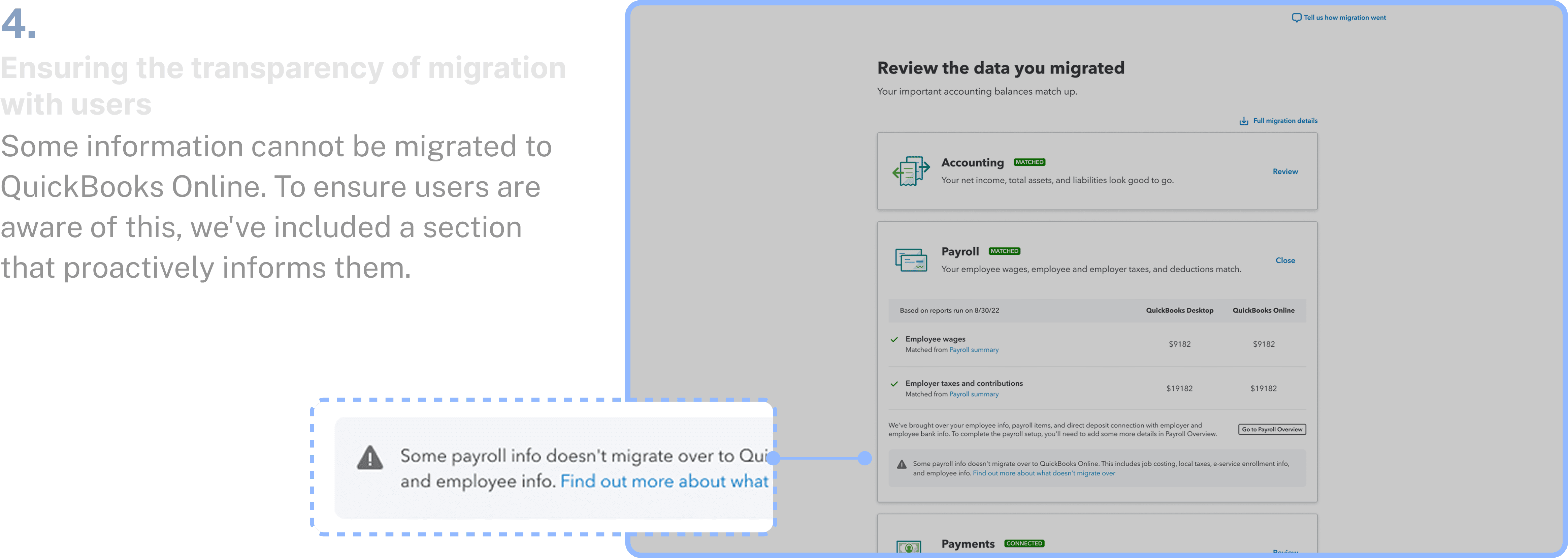 Post-migration hub gives feedback on users’ accounting data, but not payroll data, causing frustration since payroll is business-critical.