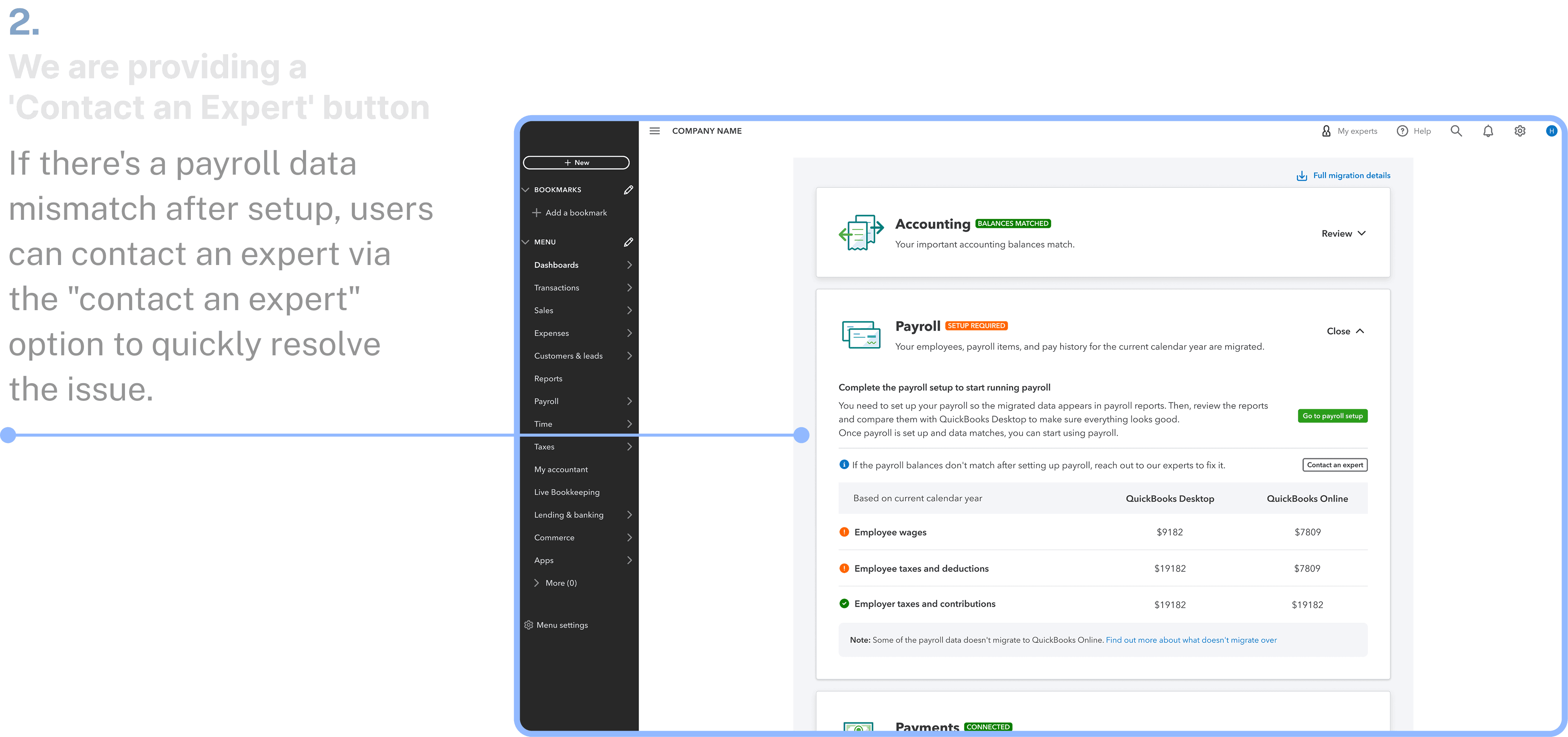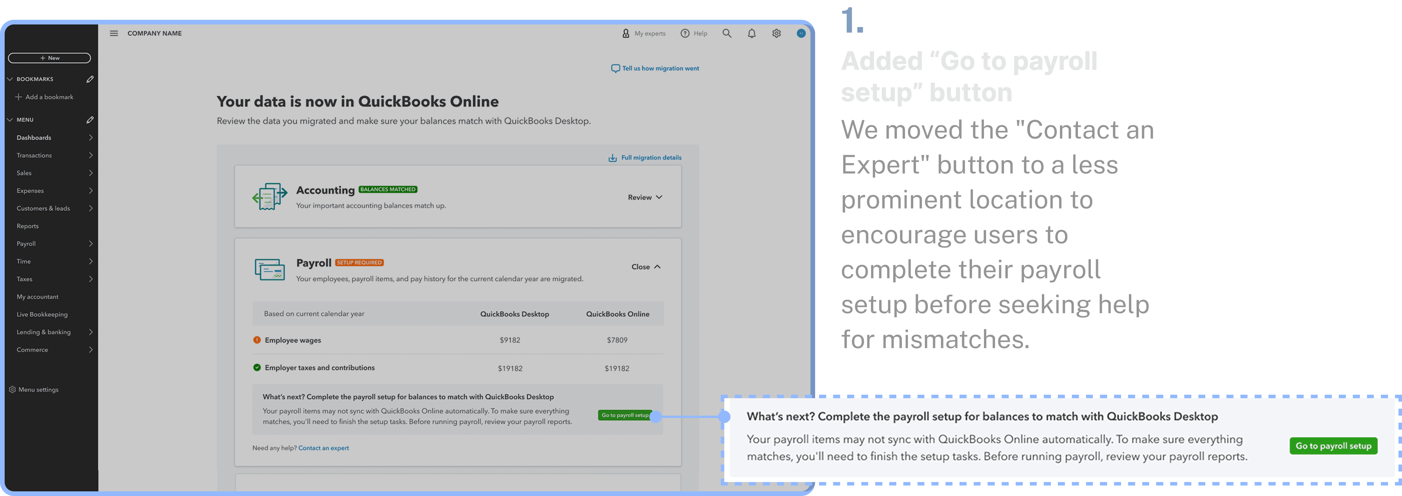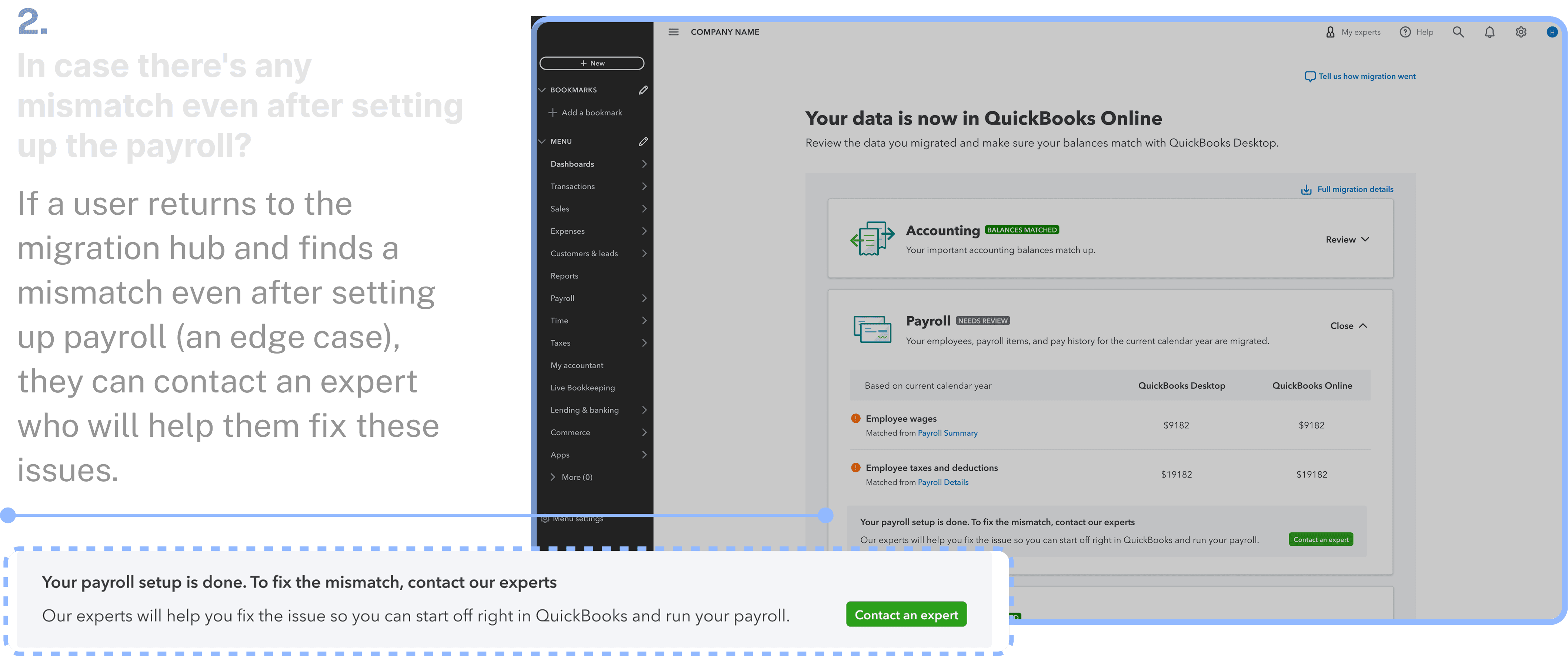 When users see a data mismatch, their first instinct is to contact an expert, but they need to complete payroll setup first. It is also unclear if the expert help is free.